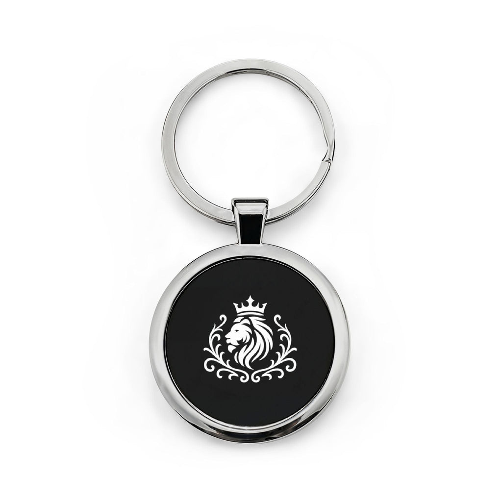 A sleek, circular stainless steel keychain that balances refined style with everyday practicality. The polished metal frame surrounds a bold, black insert featuring an elegant crowned lion crest — a quiet symbol of confidence and heritage. Slim and lightweight, it slips into pockets without bulk and holds up to daily wear thanks to corrosion-resistant stainless steel. Use it to carry house or car keys with understated flair, or add initials or a small engraving on the blank reverse for a personalized touch.