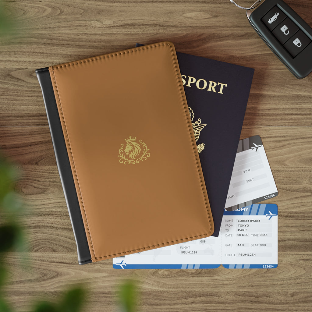 Smooth, understated, and travel-ready — this passport cover slips into your bag like a quiet companion. The warm tan front and contrasting black spine feel classic and refined, while the small gold crest adds just enough personality without shouting. Inside, neat pockets tuck cards, boarding passes, and a passport into place; the RFID-blocking lining keeps electronic thieves from rifling your data. Lightweight and durable faux leather stands up to constant handling and travel wear, while vibrant printing ensures the crest and details stay crisp. Reach for it when you’re heading to customs, breezing through an airport lounge, or slipping your documents into a daypack for a weekend away.