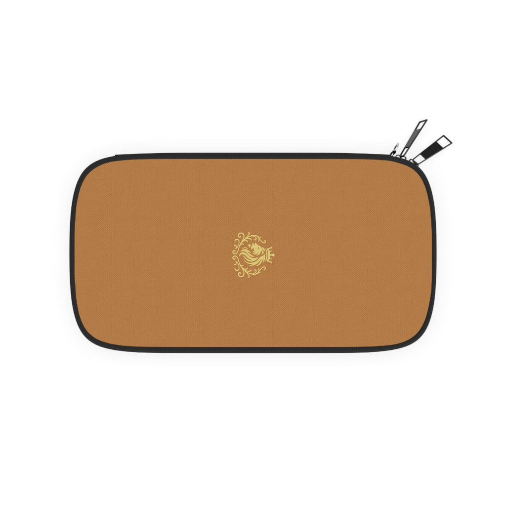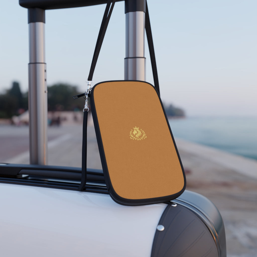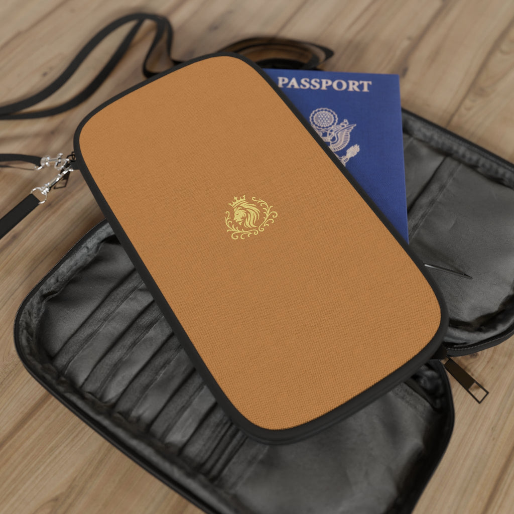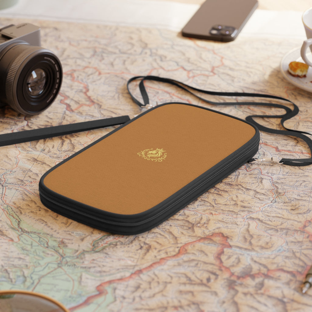 This slim, canvas passport wallet brings calm organization to travel days. Soft yet durable polyester canvas in a warm caramel tone holds a small, gold crest print at center — quiet, refined, and easy to spot in a bag. Inside, dual compartments and dedicated card and cash slots keep passport, boarding passes, and cards neatly separated. A sturdy zipper and alloy hardware glide smoothly, while the detachable black shoulder strap and wrist strap let you carry it as a wristlet or crossbody for hands-free movement. Lightweight and compact, it slips into carry-ons or a daypack and makes hectic transit feel a touch more composed.
