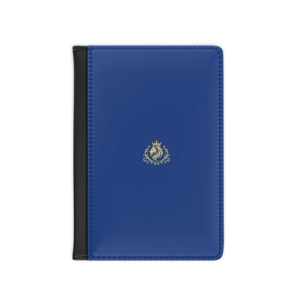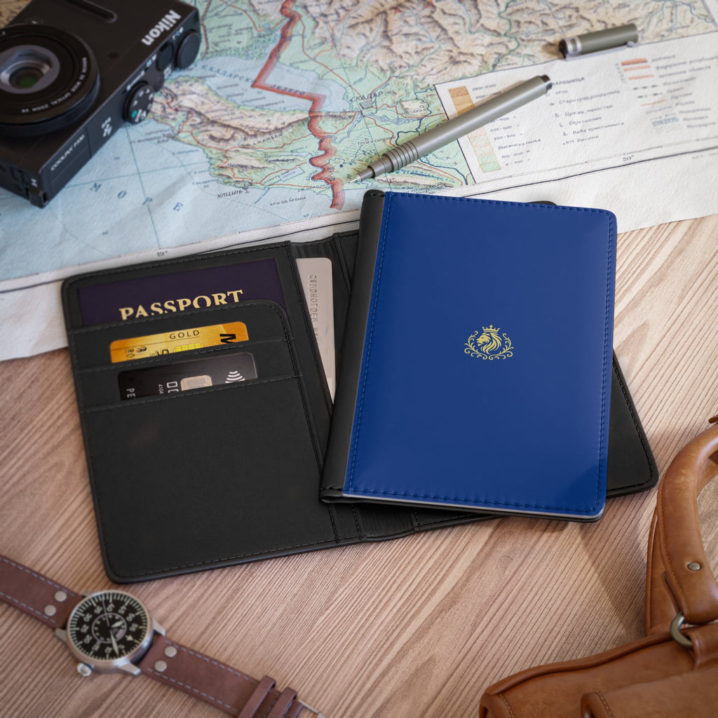 A slim, travel-ready passport cover that blends confident style with everyday protection. The smooth black faux-leather exterior and bold blue front panel are finished with a small, gold-foil crest that feels quietly upscale. Inside, neat pockets hold two cards, boarding passes, cash, and your passport without bulk. Built-in RFID shielding keeps digital details safe while you navigate airports, trains, and border crossings. This cover slips easily into a daypack or coat pocket and adds a composed, travel-savvy touch to routines — from weekend city breaks to transcontinental business trips.