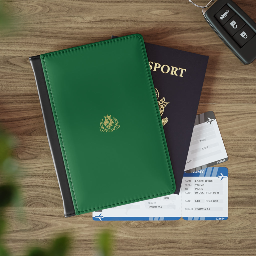 Slip this slim passport cover into your carry-on and feel the steady calm of a traveler who’s prepared. Soft black faux leather cradles a vibrant front print in emerald green and a small gold crest, a look that reads quietly confident at the check‑in desk. Inside, neat card slots and pockets keep your boarding pass, IDs and a couple of cards accessible without rummaging. RFID blocking lining adds a layer of practical protection so you can focus on the route ahead. Lightweight and compact, it fits most passports and tucks into any day bag or pocket with ease — an understated companion for trips that start with a stamped page and end in new stories.