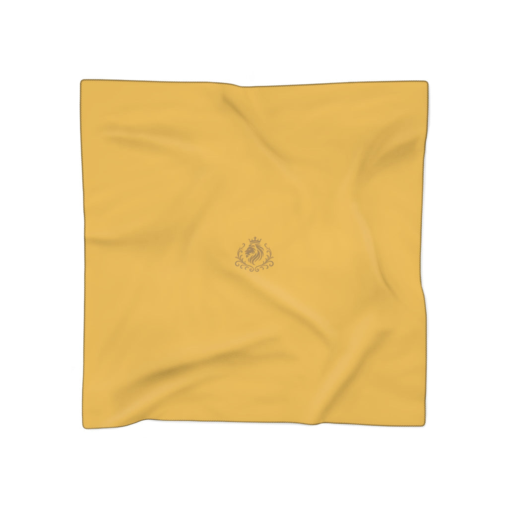 Soft, lightweight polyester drapes in a warm golden hue, carrying a quiet emblem at the center and finished with contrasting black stitched edges. This scarf feels airy against the skin and folds into a neat square or wrapped loop. It brings a subtle, refined accent to layered outfits — imagine slipping it over a denim jacket at a fall market or tucking it into a wool coat on a brisk morning. The understated crest gives it a vintage-inspired, slightly formal touch without shouting; the bright, colorfast print keeps the tone fresh and modern. Wear it loosely around the neck, tied at the throat, or knotted on a bag to add a bit of personality to everyday looks and cozy seasonal gatherings.
