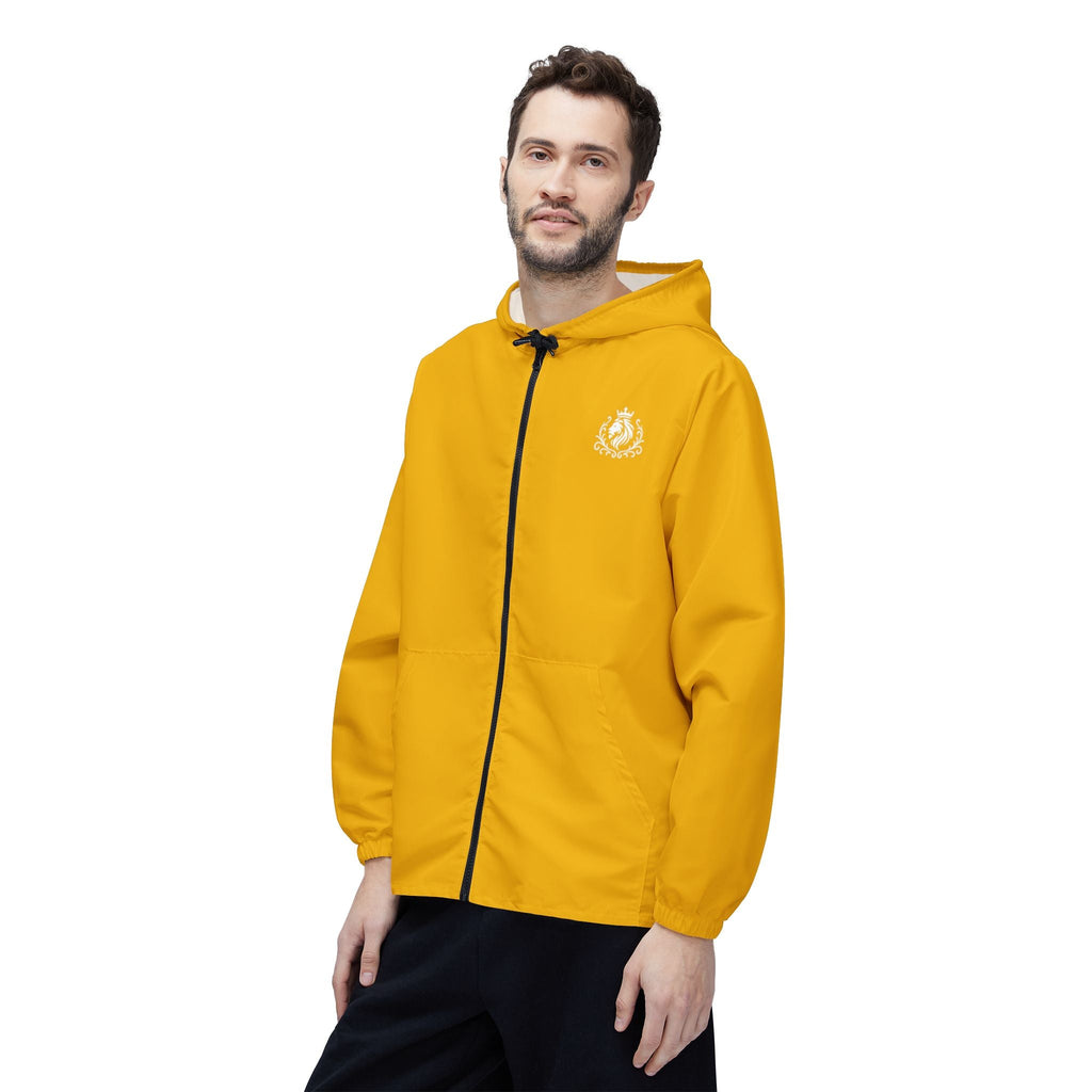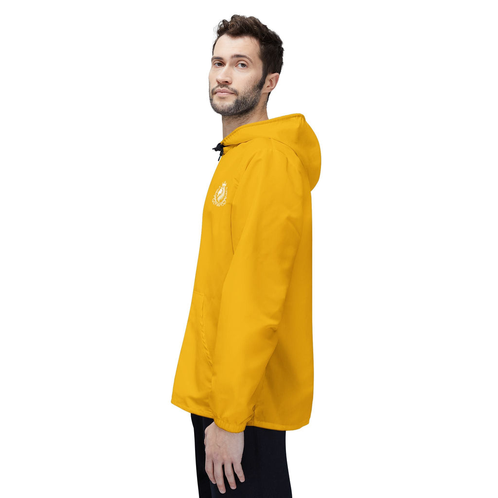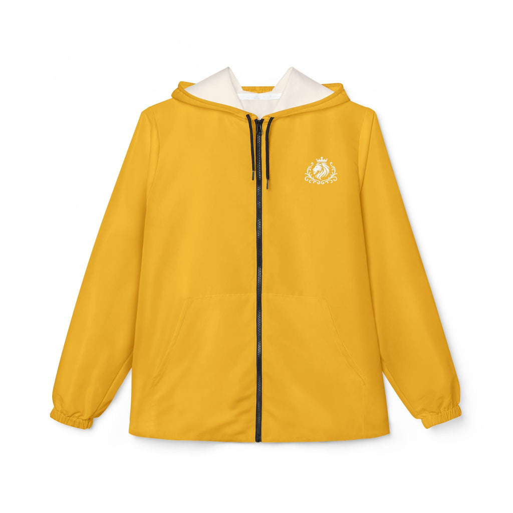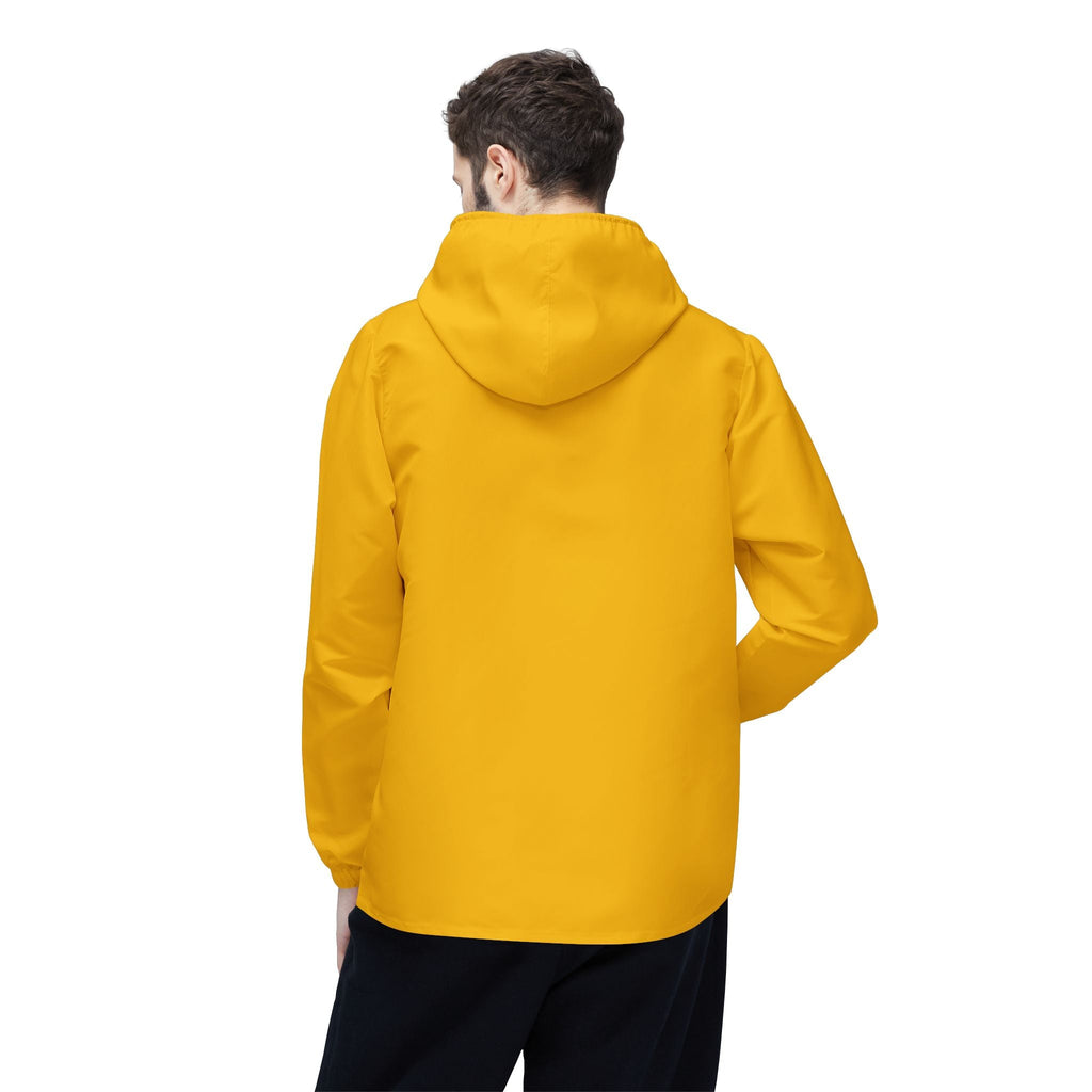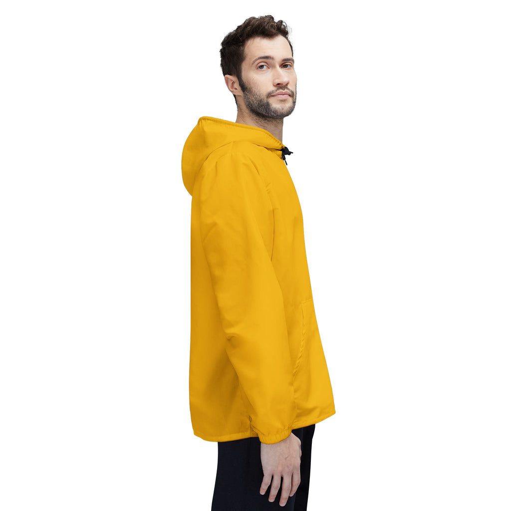 This lightweight windbreaker brings bright, sunlit energy to rainy-city mornings and breezy coastal walks. The smooth polyester shell sheds wind and light showers while keeping a slim, packable profile. Elastic cuffs and a full front zipper lock in warmth without bulk. Two roomy front pockets hold a phone and keys, and the hood adds extra coverage when clouds roll in. The bold golden-yellow color reads like a beacon — cheerful on gray days and easily layered over tees or thin sweaters. It’s made to move: quick-drying, low-maintenance, and built for days that shift between drizzle and clear skies.