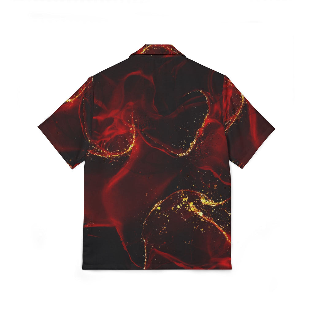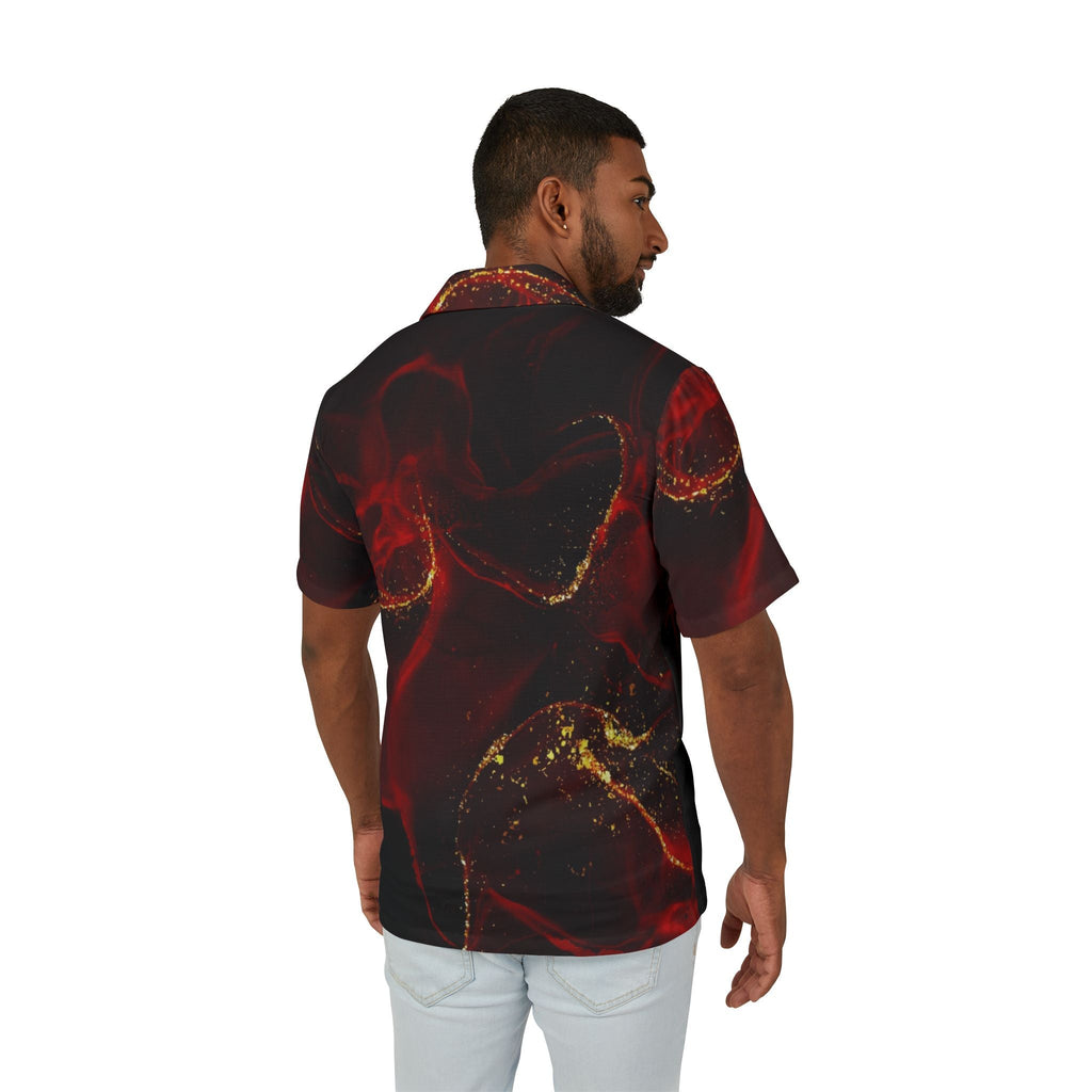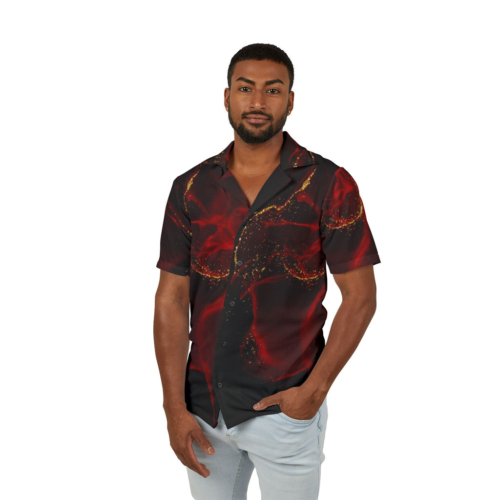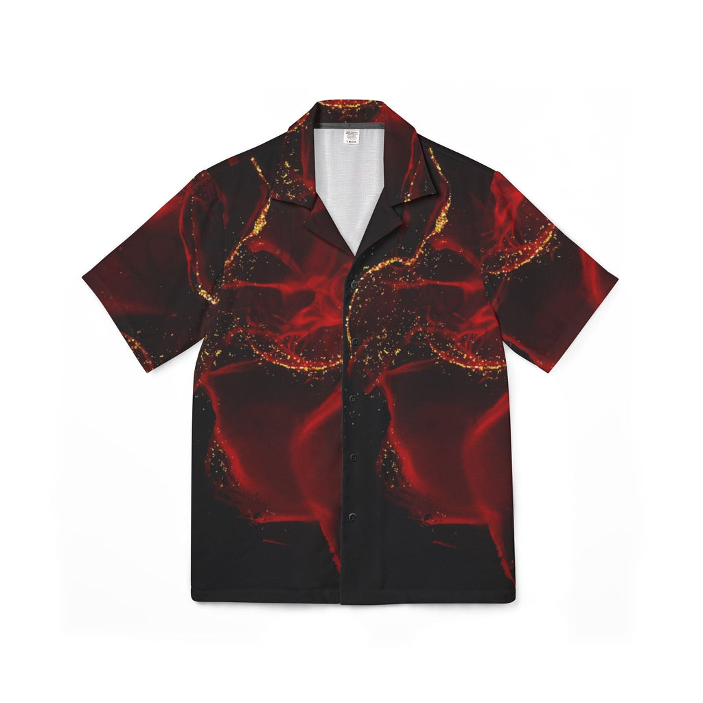 This lightweight Hawaiian camp shirt brings shadowy, molten-red swirls and flecks of gold to warm-weather wardrobes. Breathable 100% polyester with a subtle linen texture keeps the fabric airy while the dye-sublimated all-over print holds crisp, deep colors wash after wash. The relaxed camp collar and button-front silhouette read casual and intentional — wear it tucked into chinos for an evening out or untucked over swim trunks by low light. The pattern’s smoky red gradients and molten highlights create a quietly dramatic look that sits between laid-back island energy and night-out confidence.