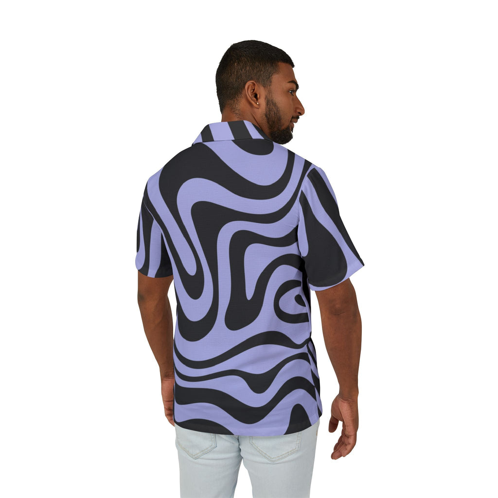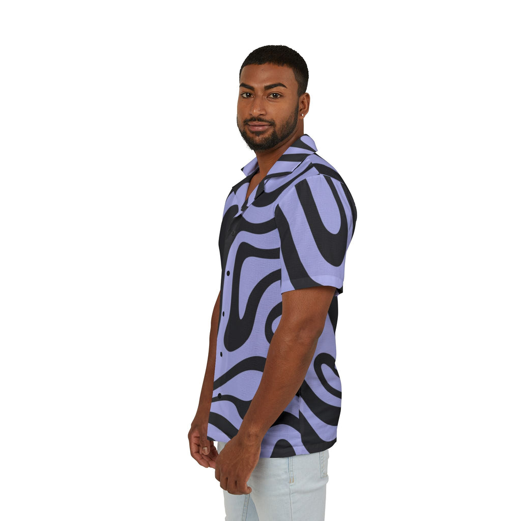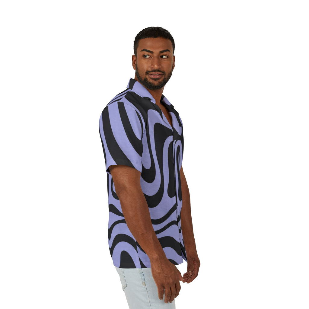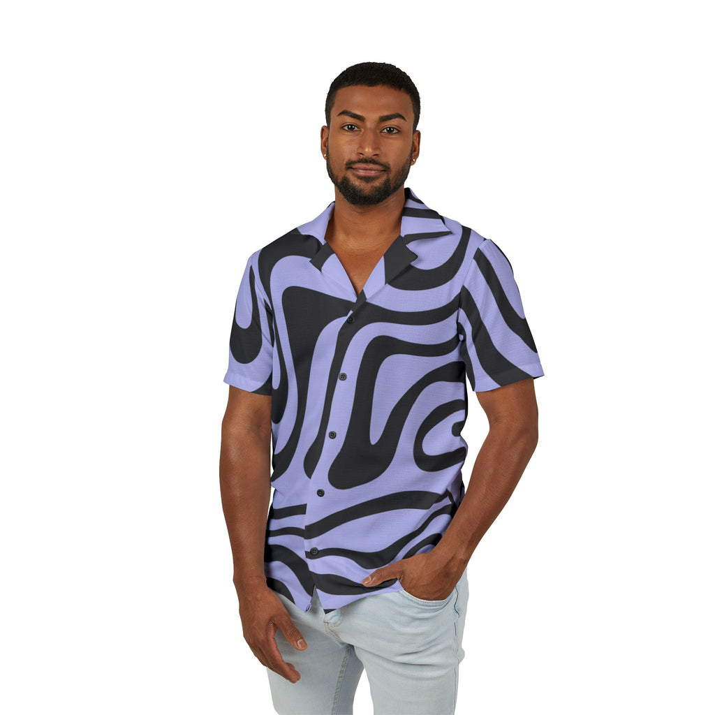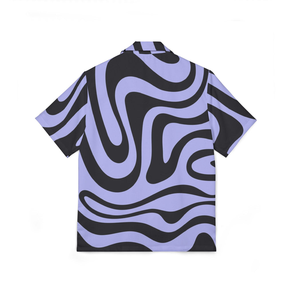 This lightweight camp shirt brings relaxed retro energy to warm days and late-night bonfires. Its fluid, wavy pattern—soft lavender waves outlined in deep charcoal—moves across the fabric like sound through air. The linen-like texture and button-front shape keep the look casual yet considered, easy to layer over a tank or wear solo. Breathable 100% polyester with dye-sublimated color means the swirls stay crisp and vibrant through wear and wash. Wear it to rooftop hangs, summer gigs, or weekend beach drives to add a confident, artful note to your rotation.