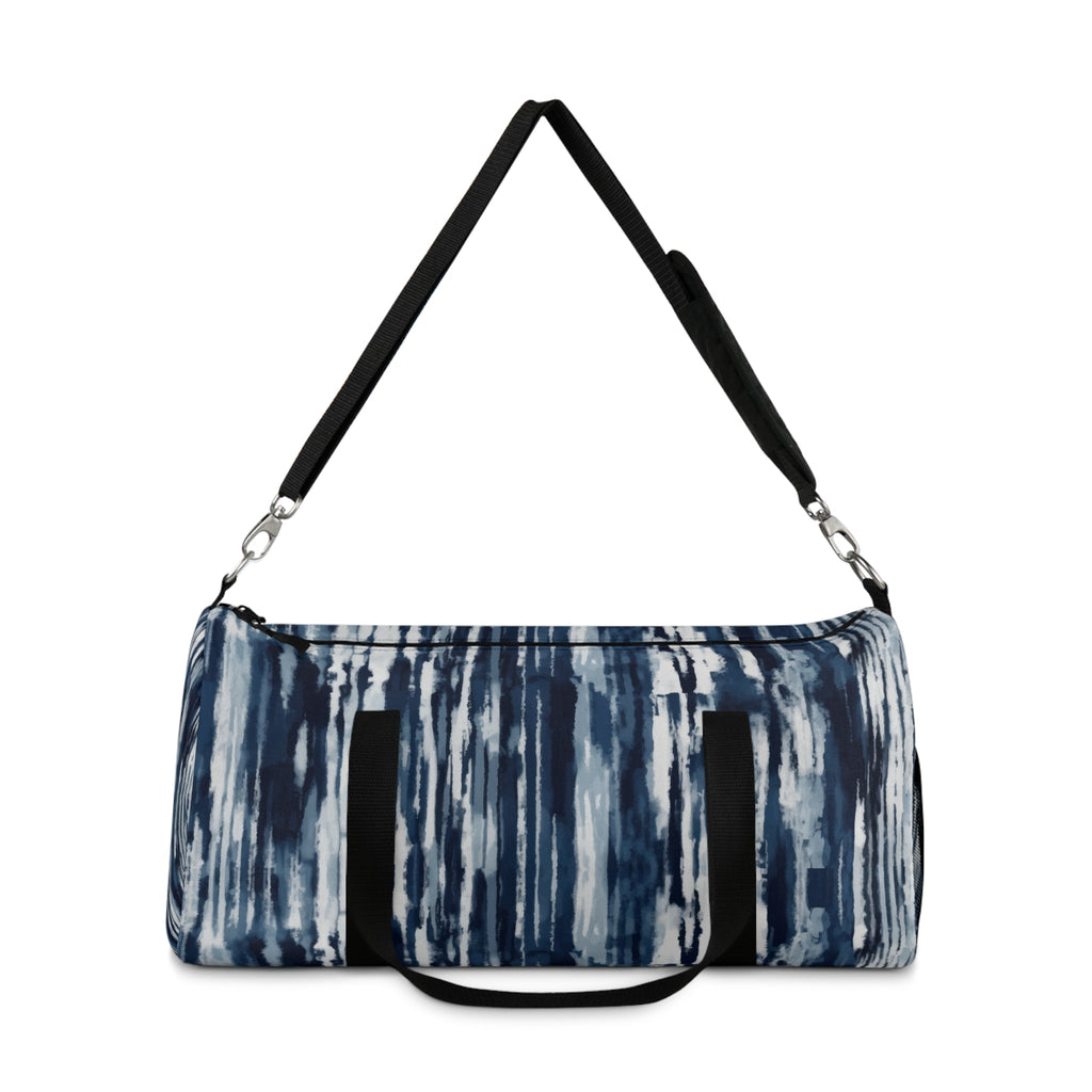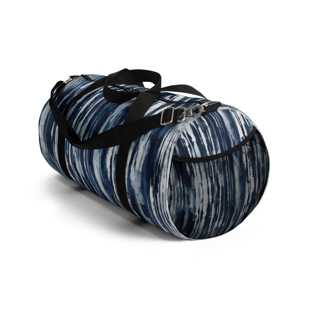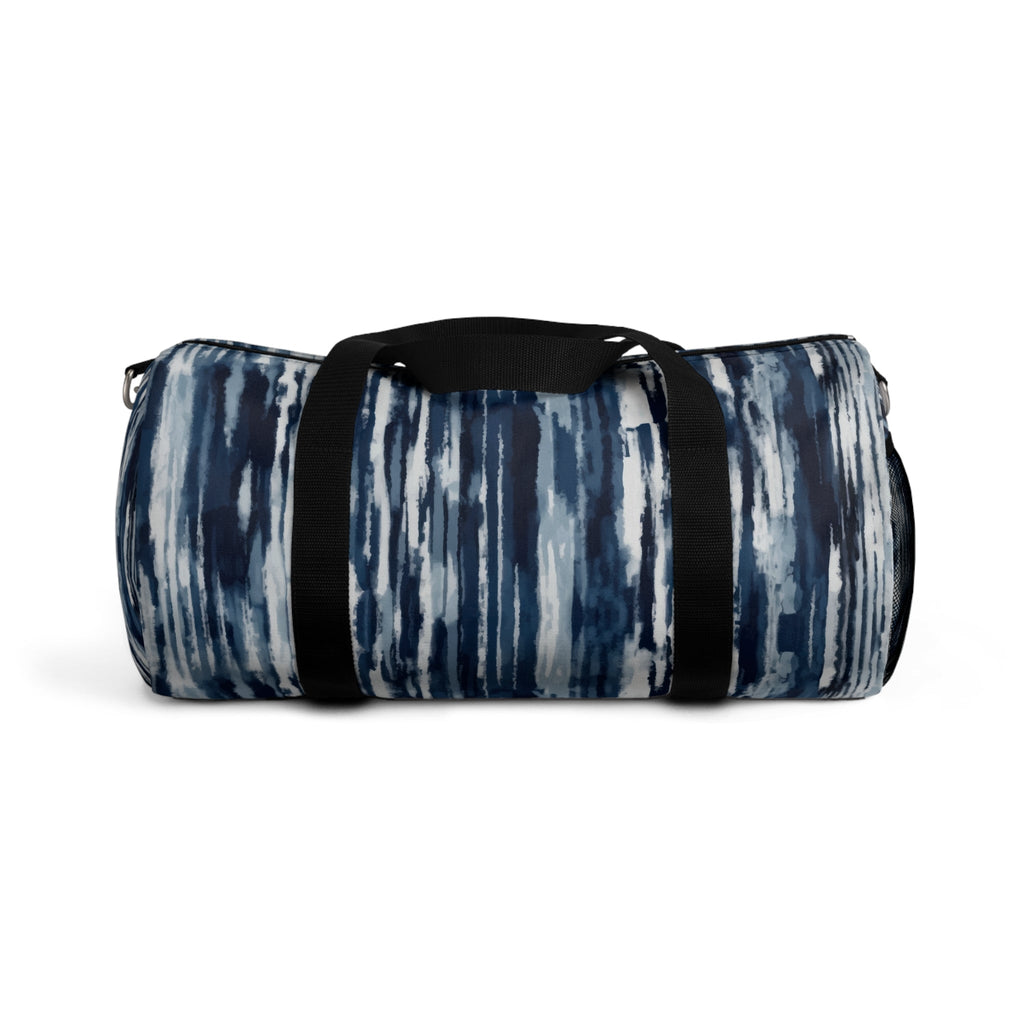 A compact, weather-ready duffel that travels like a trusted companion. The brushed navy and white wash pattern reads like wind-swept waves — relaxed but deliberate. Stash gym shoes, a weekender’s essentials, or camera gear in the roomy main compartment, then keep small valuables zipped inside the internal pocket with name tag. The adjustable, removable padded shoulder strap and sturdy carry handles make moving through crowded transit or across a parking lot effortless. Built from tough polyester Oxford canvas, it resists shape shift and dries quickly after rain or sweat. Thoughtful metal hardware and neat stitching give it an honest, lived-in look that fits into everyday routines without fuss.