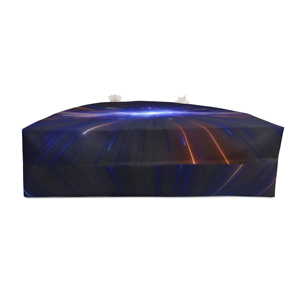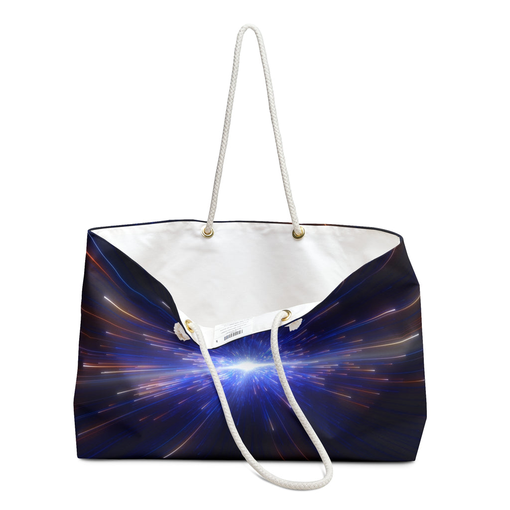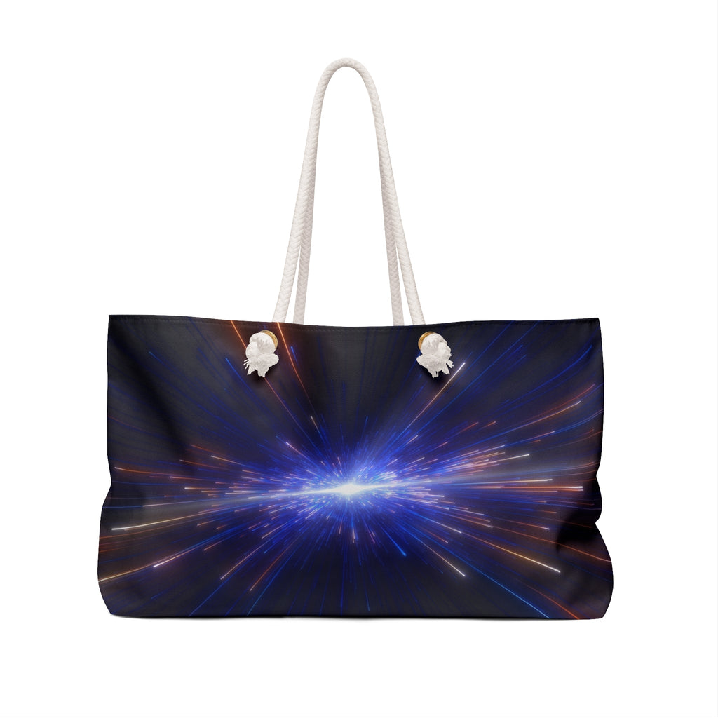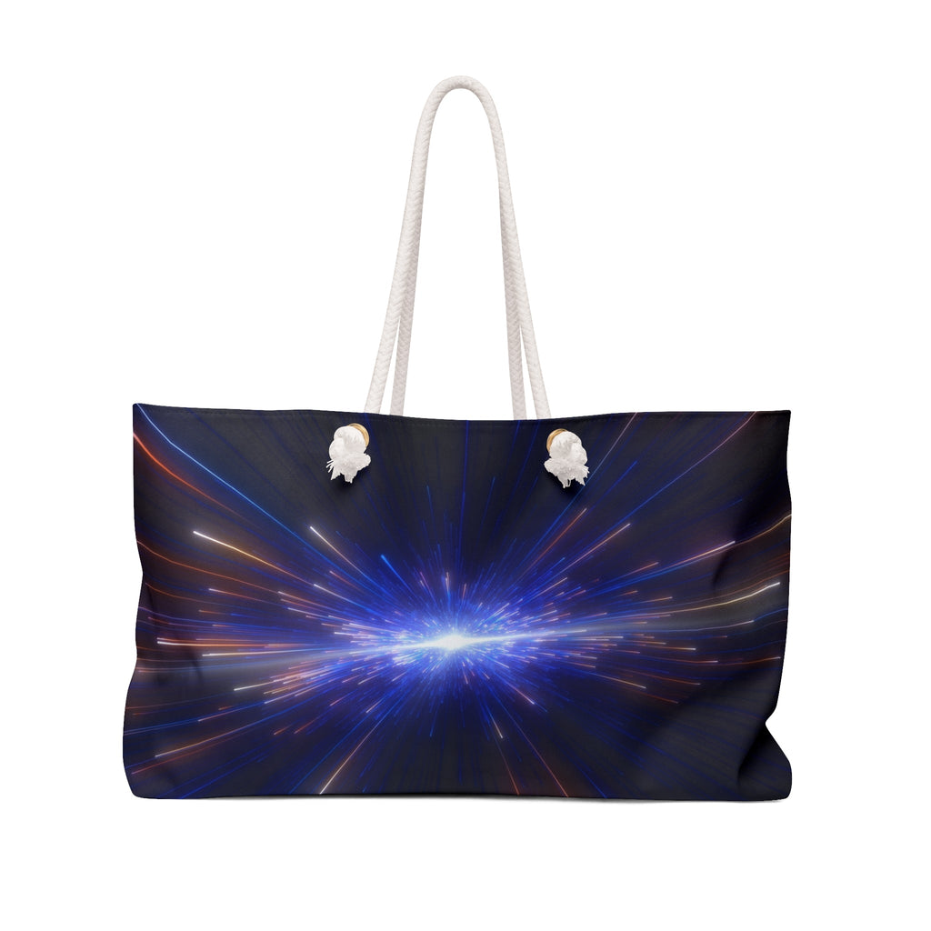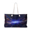 Carry a slice of the cosmos with you. This roomy weekender bag spreads a streak of deep-space blue and starlit bursts across its face, like a starfield caught in motion. The rope handles and cream interior give it a tactile, lived-in warmth that balances the energetic, galactic print. Throw in a change of clothes, a novel, and whatever small curiosities you collect on the road — the bag moves easily from overnight escapes to beach mornings and late-night drives.