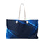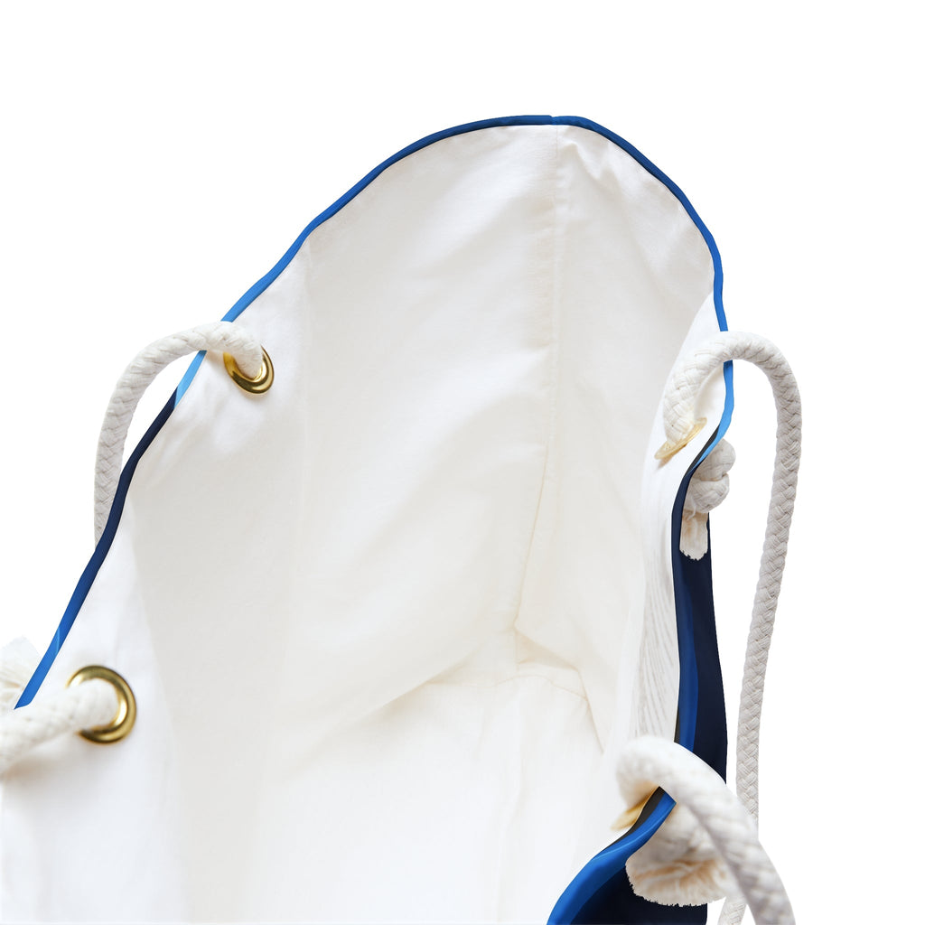 This roomy weekender brings quiet, ocean-deep blues into your escape. The long cream rope handles sit comfortably over the shoulder while the soft, spun polyester exterior resists wrinkles so the bag keeps its polished look after a travel day. Inside, a cream sheeting lining keeps small items visible and protected; the T-bottom gives structure so shoes or a bottle stay upright. Thoughtfully assembled in the USA from global parts, this bag slips easily into weekend routines — a carry-all for quick trips, coastal drives, or market mornings where you want a refined yet relaxed companion.